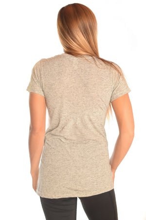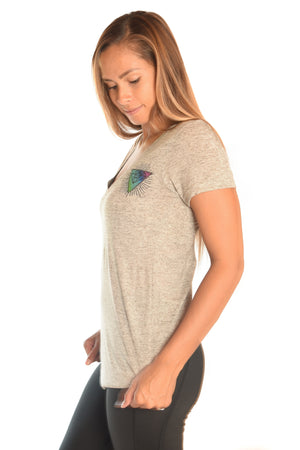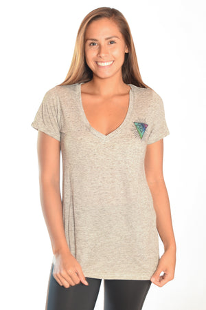 Super soft linen blend v-neck with multi crystal vibration infused Third Eye Threads logo.