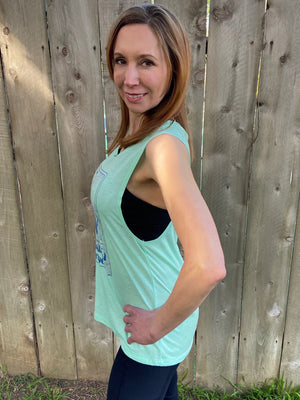 •  The elongated armholes and curved bottom hem make it a perfect layering piece with a sports bra.